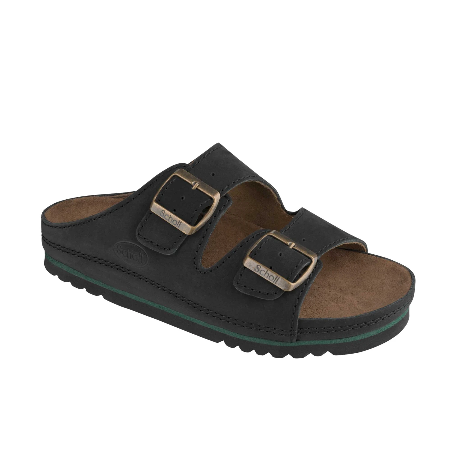 Airbase, sandalo senza cinturino con tecnologia Scholl Bioprint® Adapta, è dotato del carateristico plantare in sughero natuale e gomma ergonomicamente disegnato per mantenere il piede nella giusta posizione. Un modello pratico e casual, con tomaia con doppia fascia in nubuck che abbraccia in modo delicato il piede. Le fibbie in metallo permettono una perfetta adattabilità al piede.