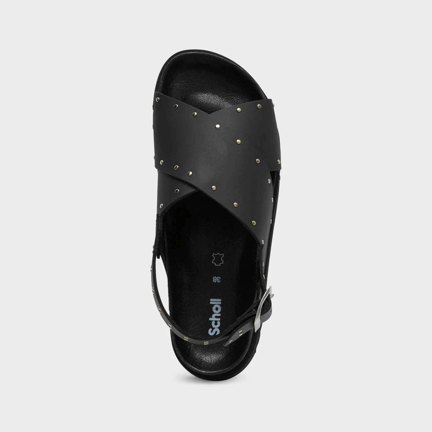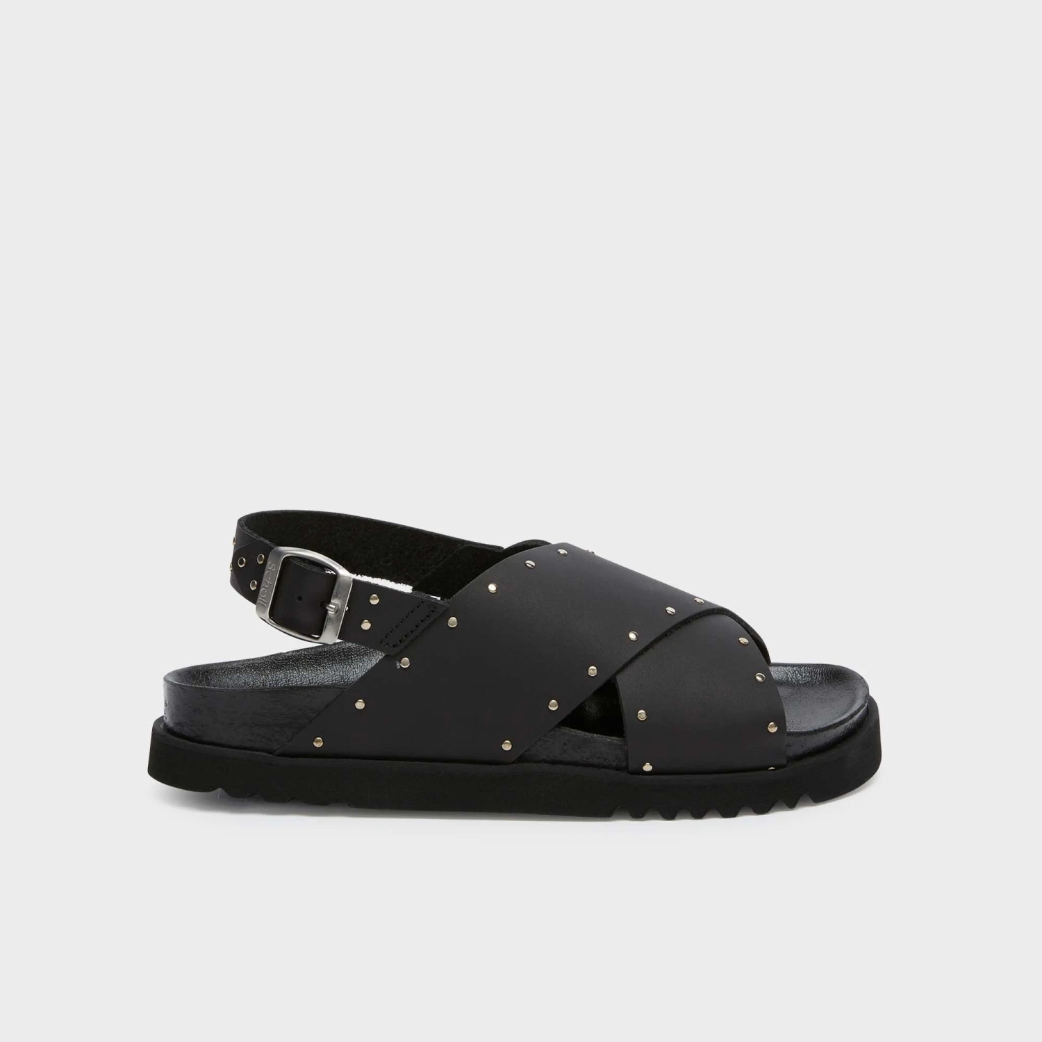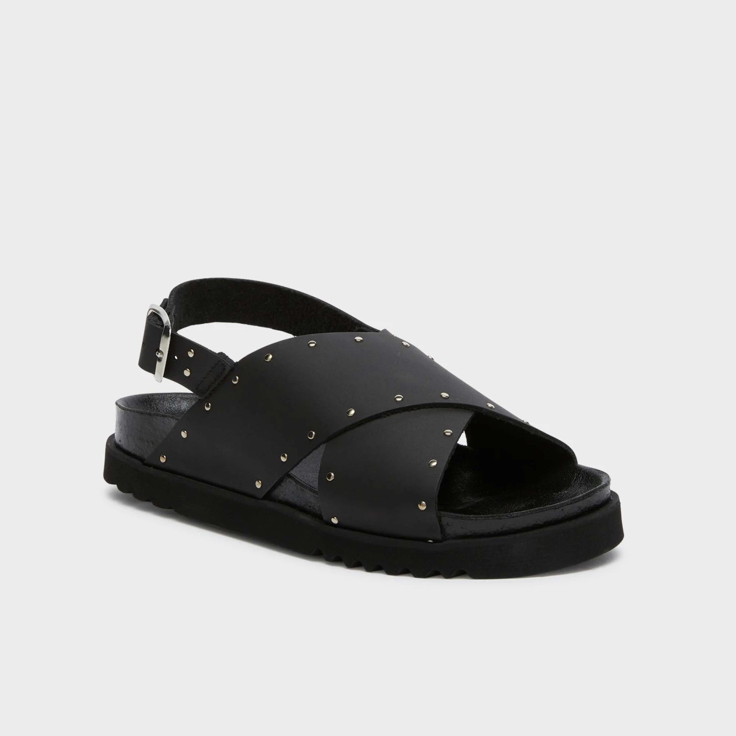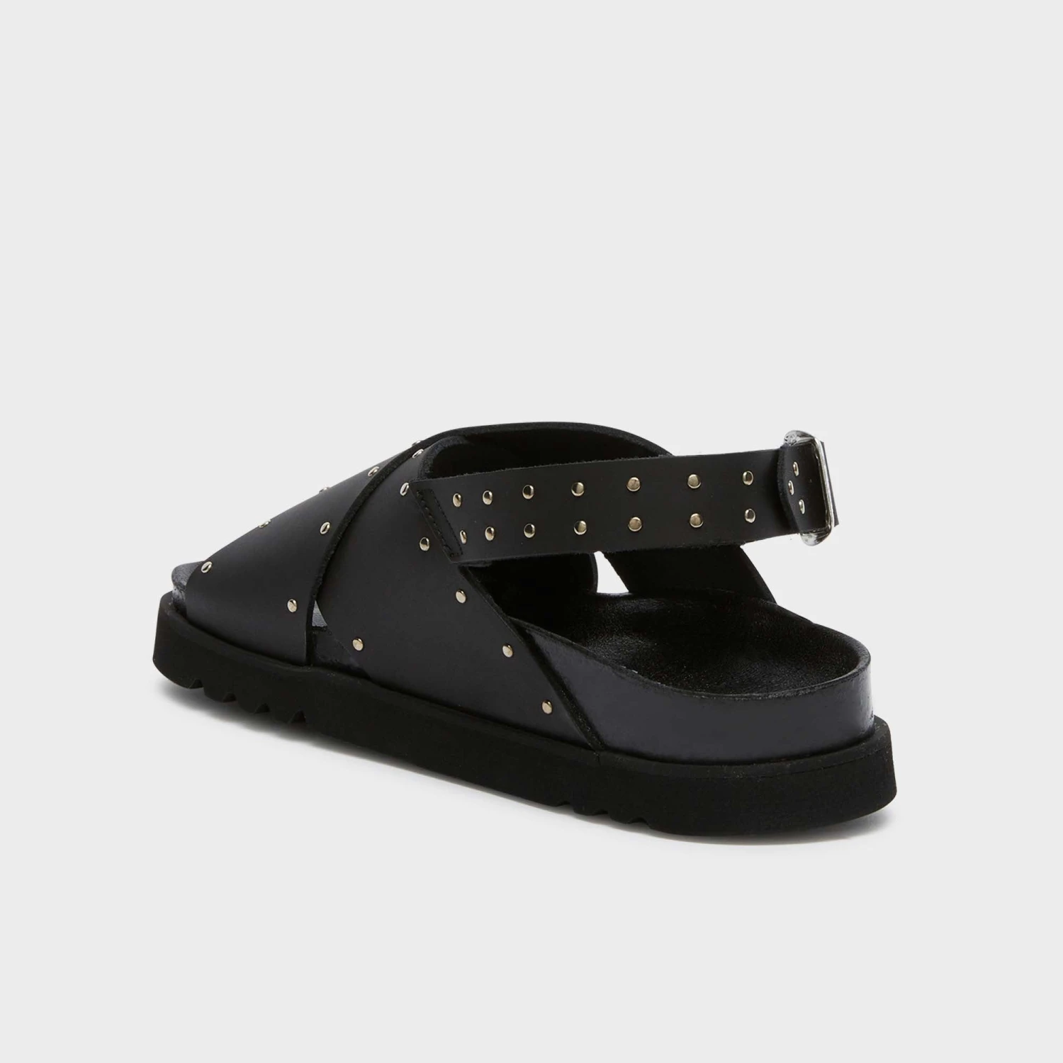 I sandali Dalia presentano un audace design con fasce incrociate, decorate con piccole borchie metalliche per un look chic e moderno. La fibbia regolabile garantisce una calzata sicura, mentre la suola spessa e strutturata offre comfort e supporto.