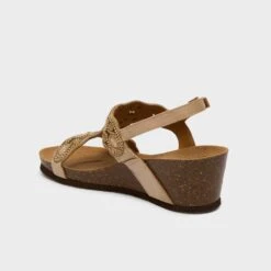 Sandalo donna dallo stile elegante e luminoso, caratterizzato da pietre decorative che donano un tocco di raffinatezza. La tomaia in microfibra, morbida e resistente, è completata da un pratico cinturino posteriore regolabile per una calzata perfetta. Dotato di tecnologia Bioprint®, sostiene l’arco plantare e favorisce una postura corretta, offrendo un comfort ideale per tutto il giorno. La suola in sughero, abbinata al tacco a zeppa, assicura supporto e un leggero slancio, rendendolo perfetto per arricchire con eleganza i tuoi outfit estivi.