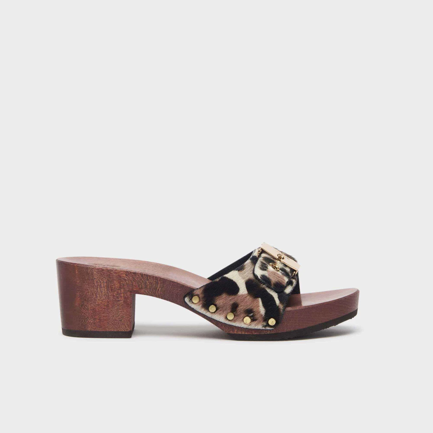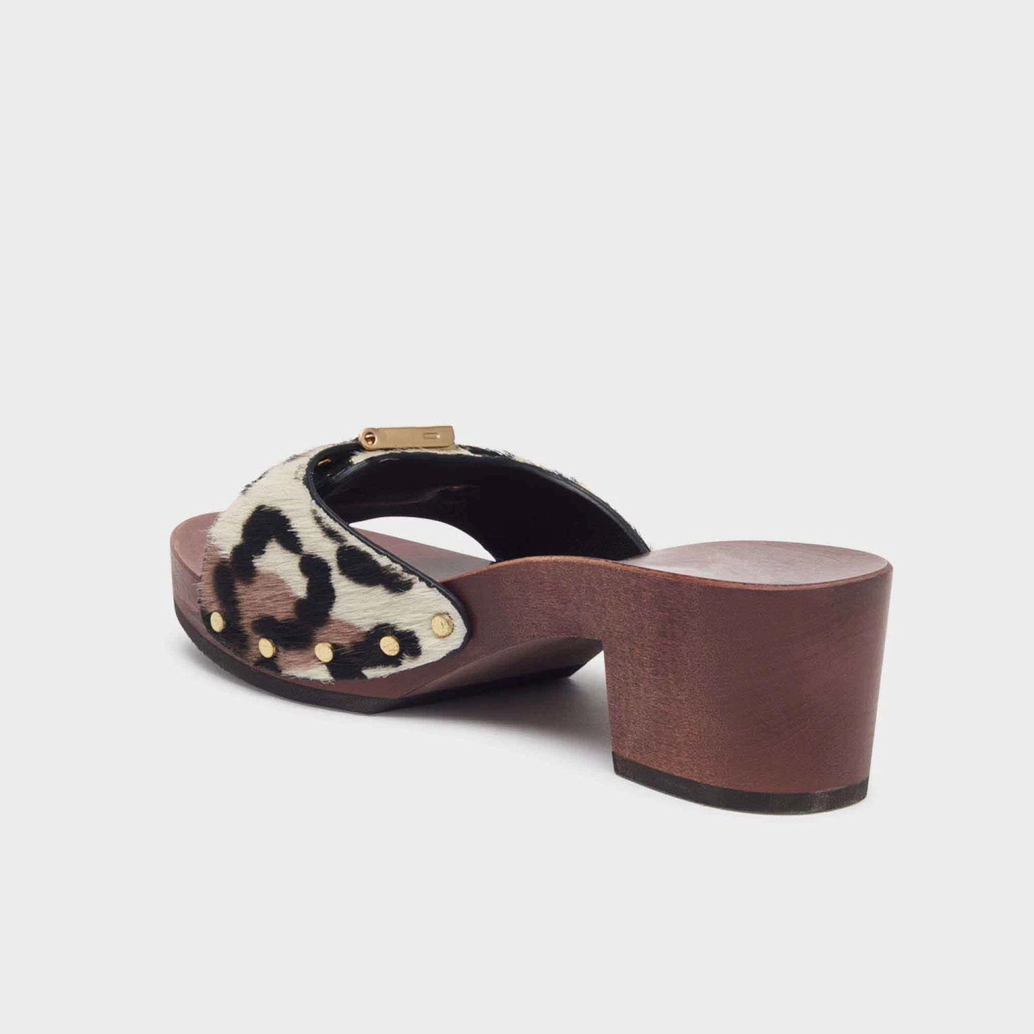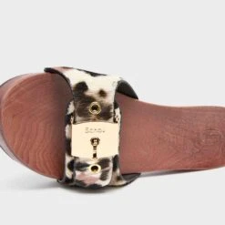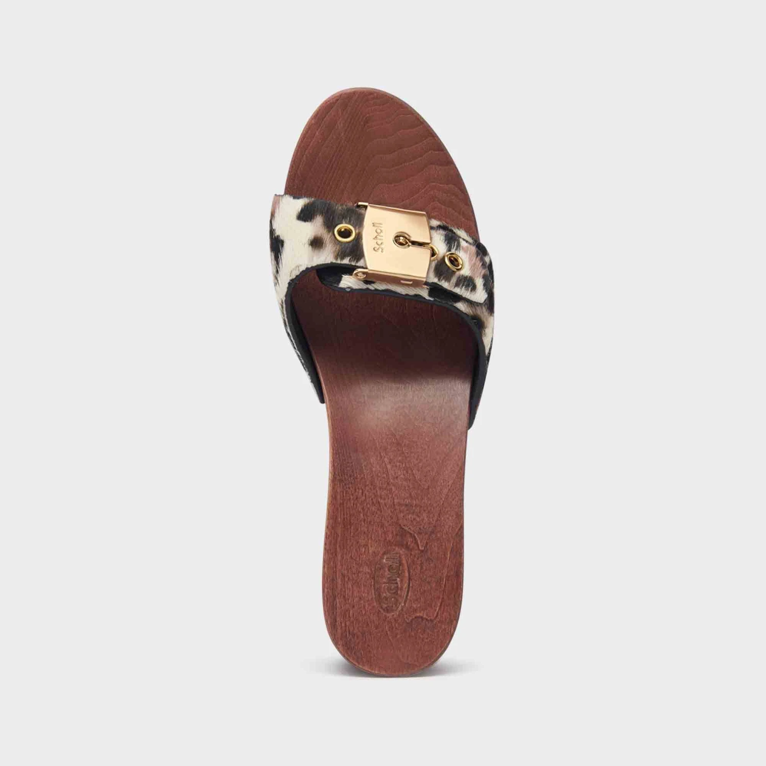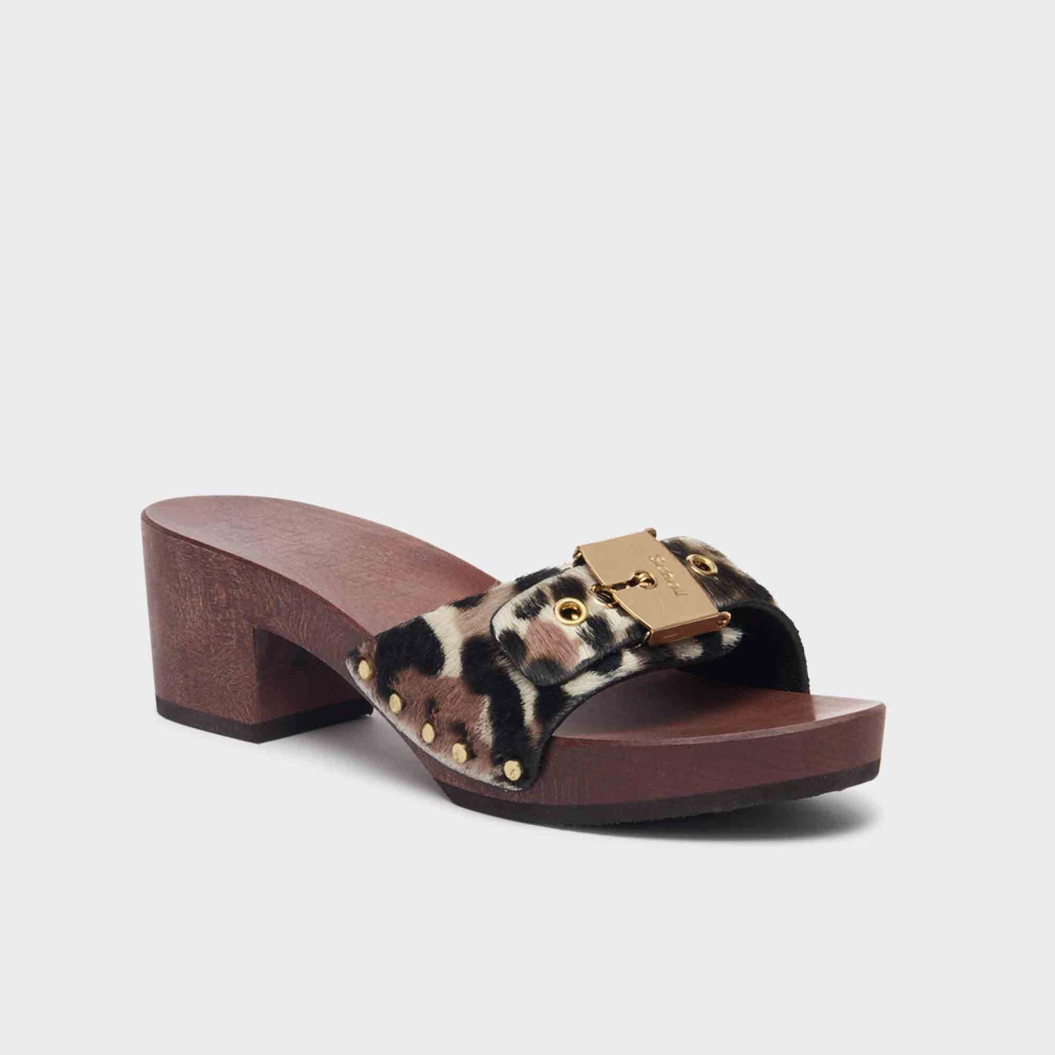 Caratterizzato dall’iconico tacco in legno Scholl, il modello Pescura Ibiza 2.0 si distingue per la tomaia in cavallino con un audace design animalier e dettagli di borchie dorate, che aggiungono un tocco alla moda. Perfetto per un look chic e una calzata confortevole per tutto il giorno.