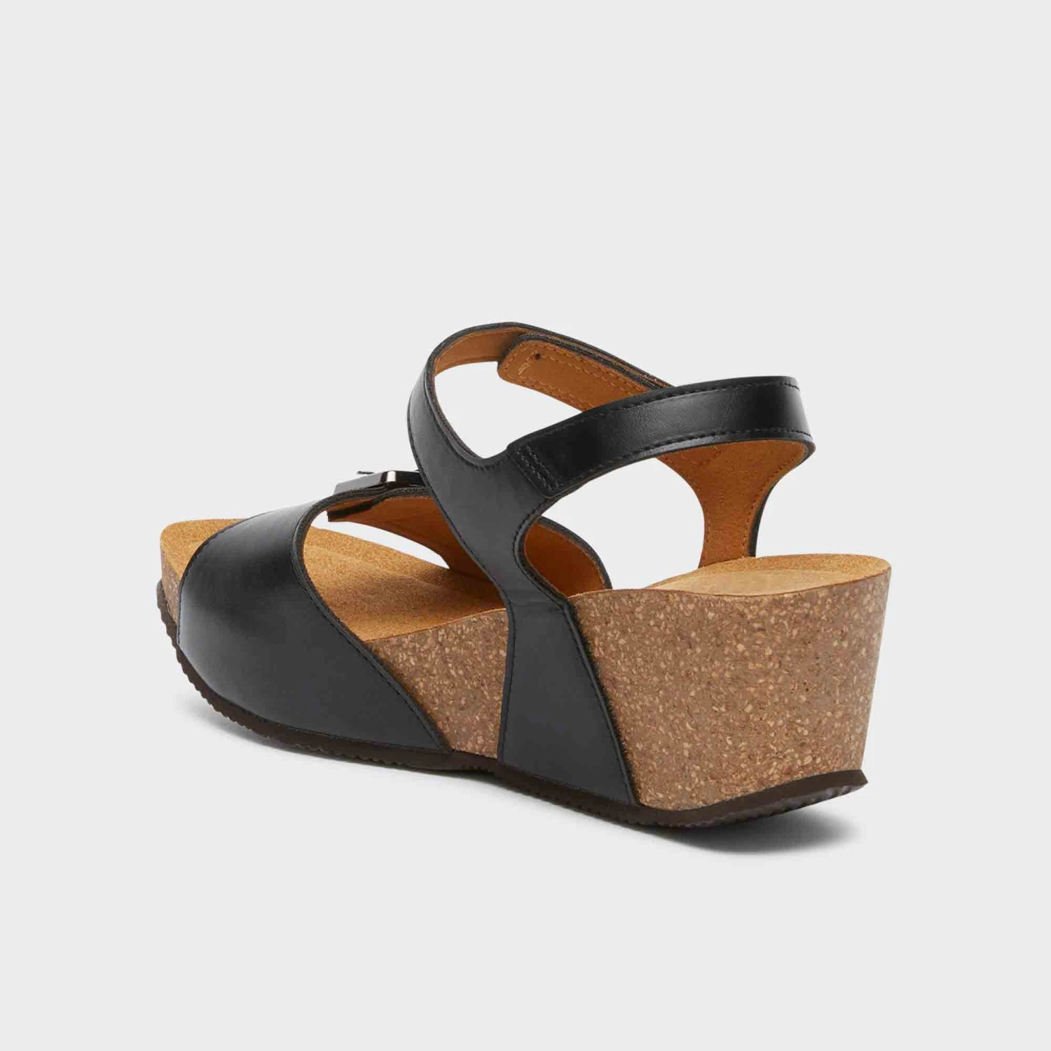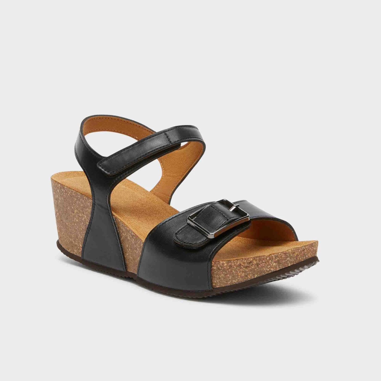 Sandalo con zeppa dal design raffinato, arricchito da una pratica chiusura a strappo e dettagli decorativi. Grazie alla tecnologia Scholl Memory Cushion®, la soletta distribuisce uniformemente la pressione, offrendo un comfort prolungato e un supporto ottimale. La zeppa in sughero naturale dona eleganza e leggerezza, mentre la tomaia assicura una calzata stabile e confortevole. Ideale per un look estivo che unisce stile e benessere.